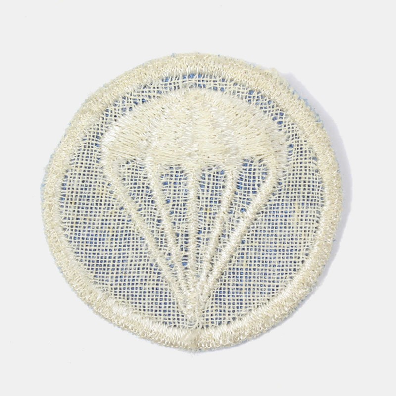 Cet insigne est original. Il était porté sur le calot des parachutistes. Premier modèle, Version infanterie sur fond bleu, fabrication Twill.