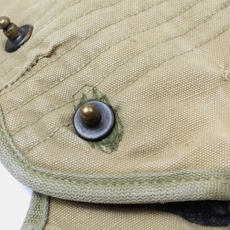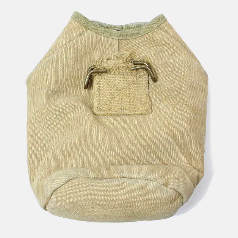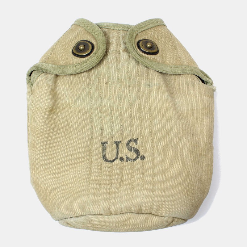 Cette housse est fournie à tous les soldats de l'armée américaine afin de ranger la gourde et le quart durant la Seconde Guerre mondiale. Cette housse originale montre des signes d'usure et défauts (réparation d'époque pression, couture boucle, feutrine intérieure, marquages).