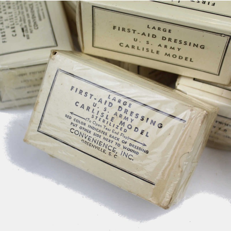 Bandage original jamais déballé encore conditionné dans son carton. Produit pour l'armée américaine lors de la Seconde Guerre mondiale. Cette pièce de stock est dans son état d'origine. Vous recevrez un bandage.